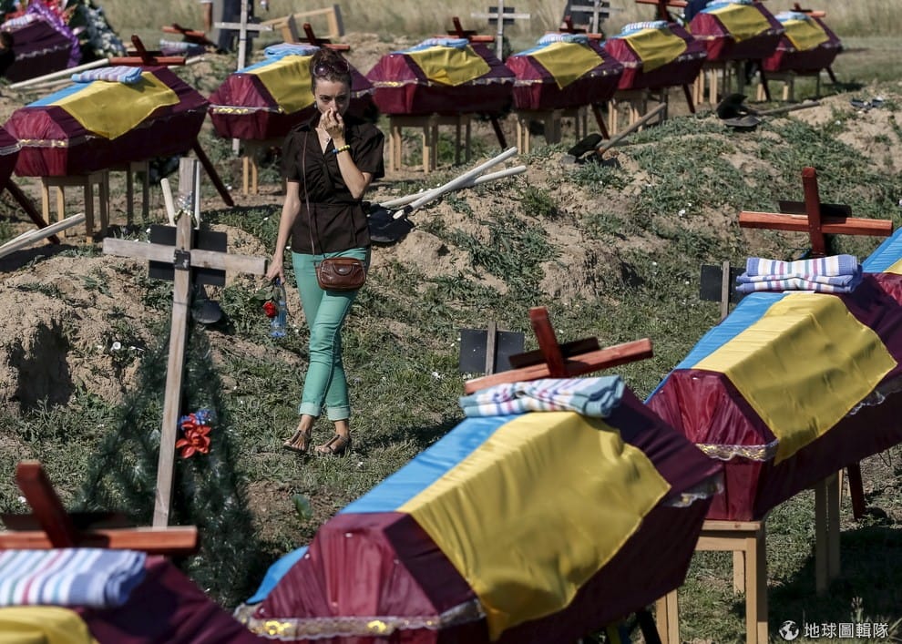 先前烏克蘭衝突正烈的時候,前線死傷無數,圖為一名女子緩緩走過一具具裝著軍人屍體的棺木。