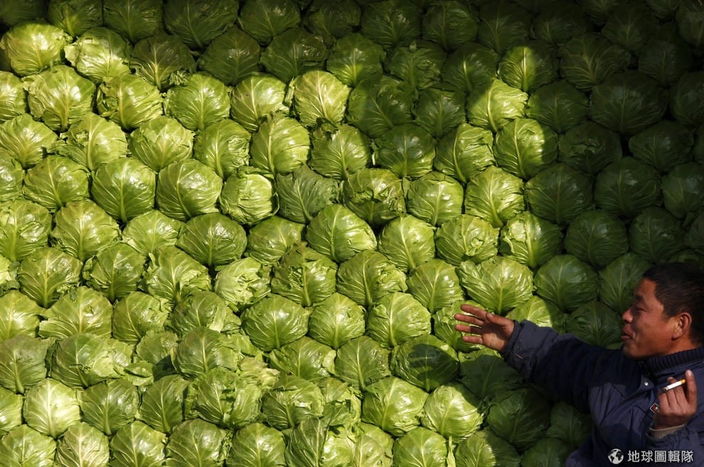一名小販站在疊得整整齊齊的甘藍菜旁。