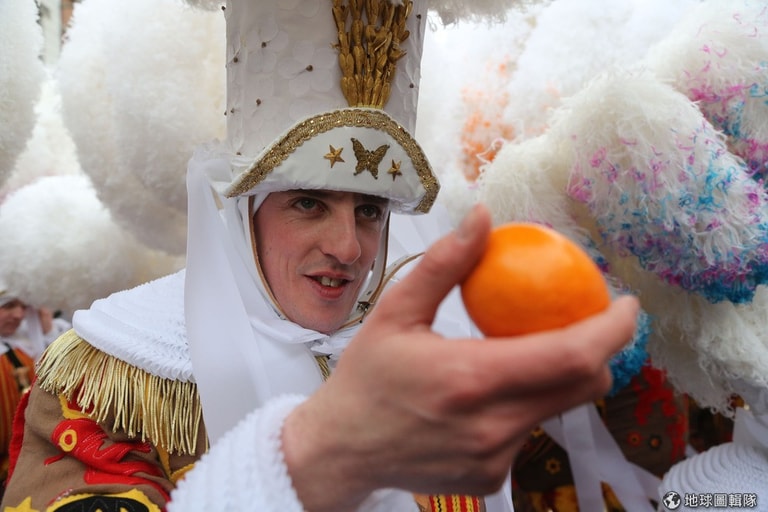 這些服裝「奇特」的表演者,在活動後半段還會再換上巨大的白色鴕鳥帽,並開始朝圍觀人群丟柳丁。據說被丟到的人就會有好運,如果一時氣惱把柳丁往表演者丟回去的話,可是會招來壞運的喔!