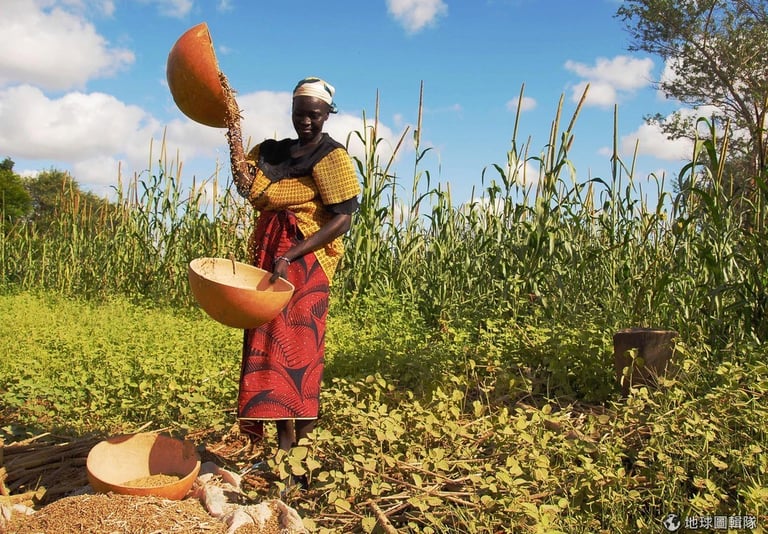 一名非洲女子在田中整理穀物,這些穀物可以拿來釀製香醇的美酒。