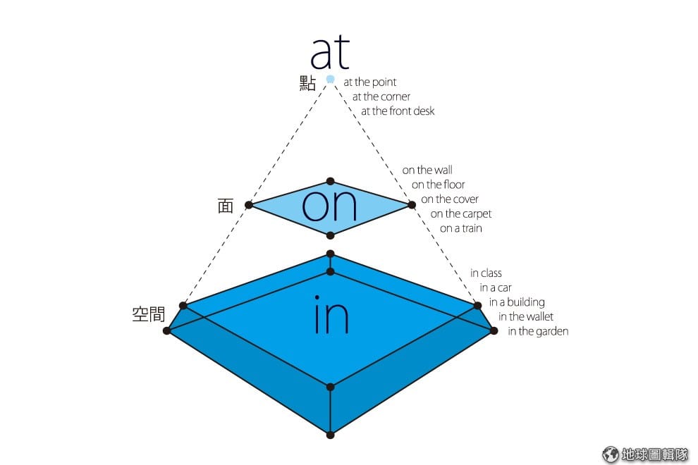 - In是一個空間。空間可以大到是宇宙、山川、國家、城市,也可以小到一個車子、杯子、眼睛,所以是in the mountains、in the river、in Taiwan、in Taipei、in a car……。