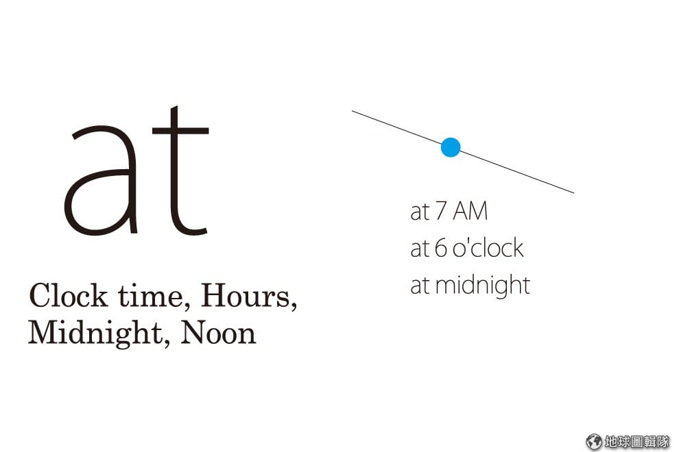 At表示特定的時間點。想像時間是一條線,at就是線上的某個時間點,強調事情發生的那一刻,例如: