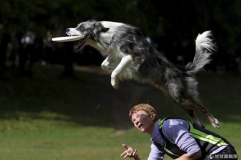 一隻狗狗飛躍而起一口咬住主人丟出的飛盤,莫斯科當地正在舉辦狗狗飛盤大賽,考驗主人跟狗狗的默契。