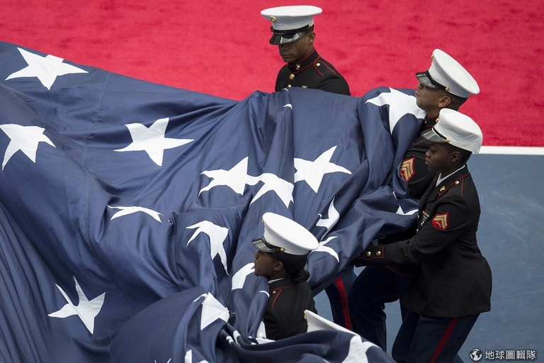 在一年一度的美國網球公開賽女單決賽前,一群海軍陸戰隊員拿著大型的美國國旗。美國網球公開賽是每年第四項也是最後一項網球大滿貫賽事,通常在 8月底到 9月初舉行,自 1978年開始,賽事在位於紐約皇后區法拉盛草原公園的USTA國家網球中心舉行。目前男、女單打的冠軍都可獲得高達三百萬美元以上的獎金。