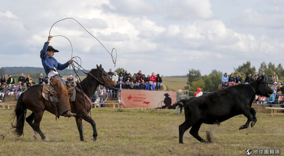 一名牛仔揮動手中的繩索,想要套住往前急奔的小牛,俄國東南部正在舉辦牛仔大賽,場面熱鬧滾滾。