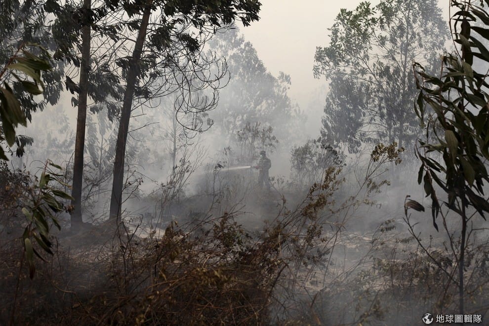一名消防隊員在森林大火造成的濃霧中灑水。近日,印尼的蘇門答臘島和加里曼丹島因為農民使用火耕的關係,造成森林大火,印尼也將派出一千多名消防員前往起火處打火,大火造成的濃煙也影響到當地居民的健康,還造成飛機無法正常起降,而濃煙也飄到鄰近的新加坡還有馬來西亞,造成當地空氣汙染。