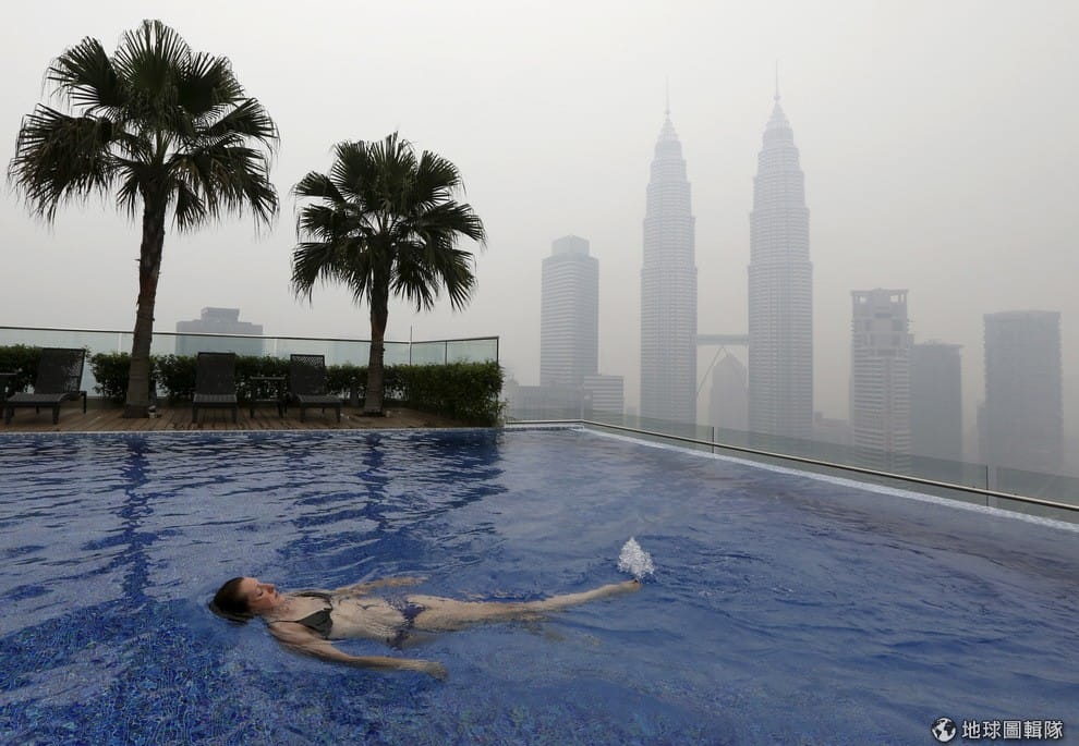 一名女子悠游在可以眺望吉隆坡雙子星塔的泳池中,她的周遭霧濛濛一片,這些霧來自鄰近的蘇門答臘島和加里曼丹島,根據當地報導,印尼的這兩個島習慣用傳統的「火耕」方式種田,火耕的一大特色就是農民靠著放火燒田來清理耕地,造成每年都會傳出森林大火,加上兩個島都有許多大型的椰子油工廠和造紙工廠,往往讓火勢更一發不可收拾,產生的濃霧也會一路飄到馬國,影響空氣品質。