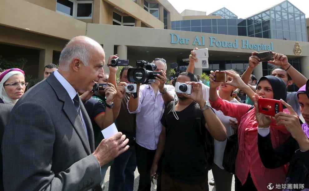 身穿西裝的埃及觀光部部長拉米一走出觀光客就醫的醫院,立即被媒體團團包圍。