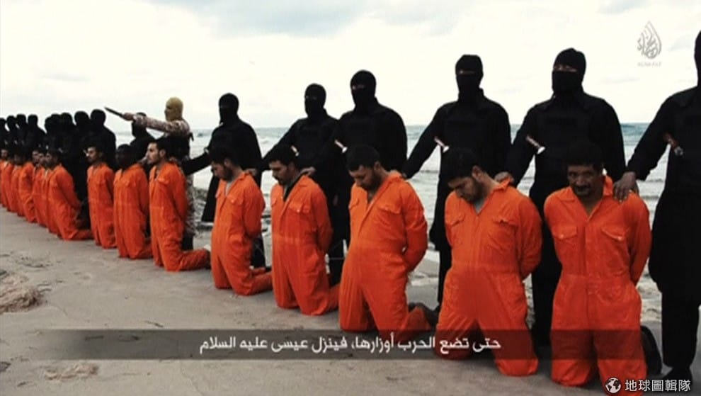 一群伊斯蘭國恐怖分子押著身穿橘色連身衣的埃及基督徒,來到利比亞的海灘上斬首。