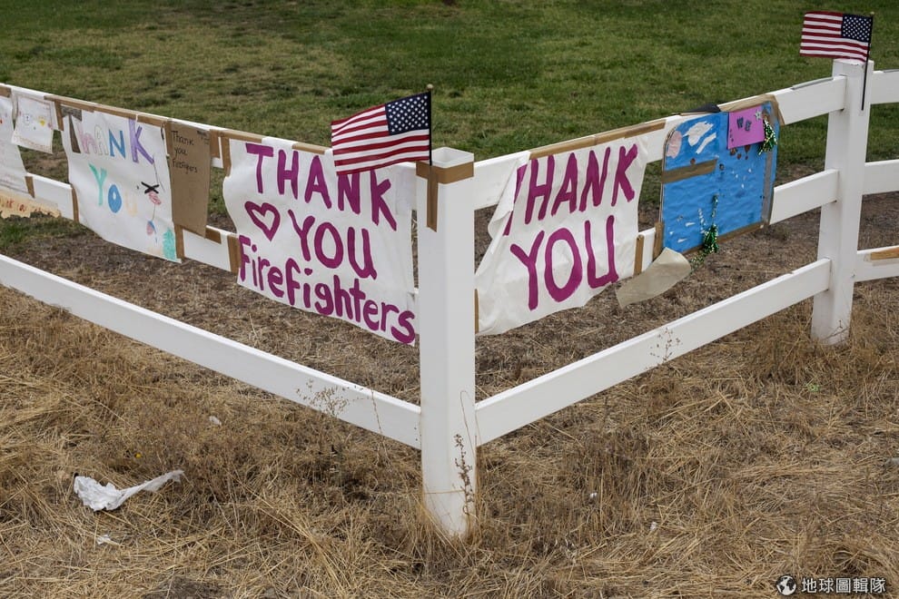 路透社加州隱谷湖(Hidden Valley Lake)的民眾留下標語,感謝消防人員的付出。