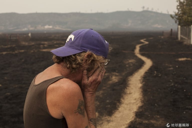 一名男子因為擔心家中房產被大火吞噬,已經很久都沒有睡個好覺,等他跑到現場發現房產付之一炬後,痛苦地將臉埋在雙掌間。