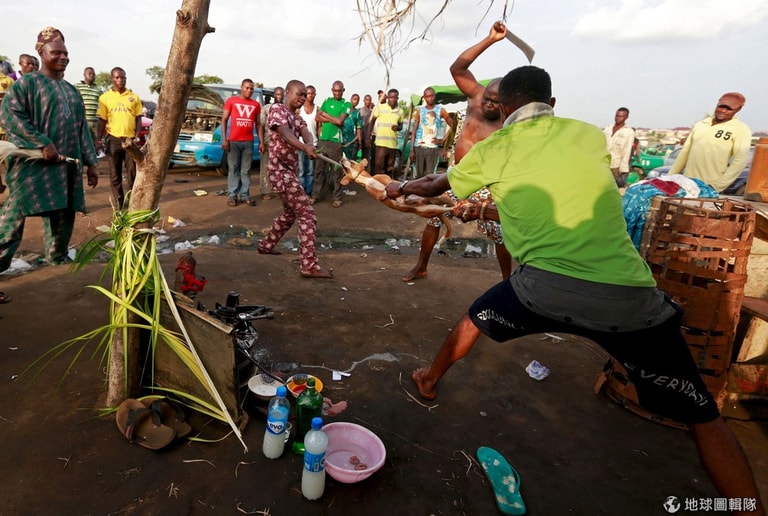 兩名男子將狗架起,一旁的大祭司拿起短劍準備結束狗的生命,以表對金屬之神奧貢(Ogun)的崇敬。每年,奈及利亞從事和金屬相關行業的人,例如板金工、技工、鐵匠等都會齊聚一堂用狗做牲禮獻給金屬之神奧貢,藉此祈求來年一切順利。大祭司也會把狗血塗在鑰匙、板手和其他金屬工具上。