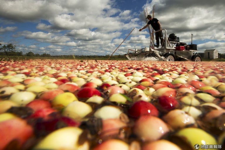 在麻州的卡佛,農人們用「水採法」(Wet Harvest)來採收蔓越莓,他們先將蔓越莓田注滿水,隨後啟動採莓車,採莓車特製的旋轉棒可以將和藤蔓相連的蔓越莓拍落水面,讓一顆顆的蔓越莓浮在水面上,形成一片紅通通的美麗莓海。