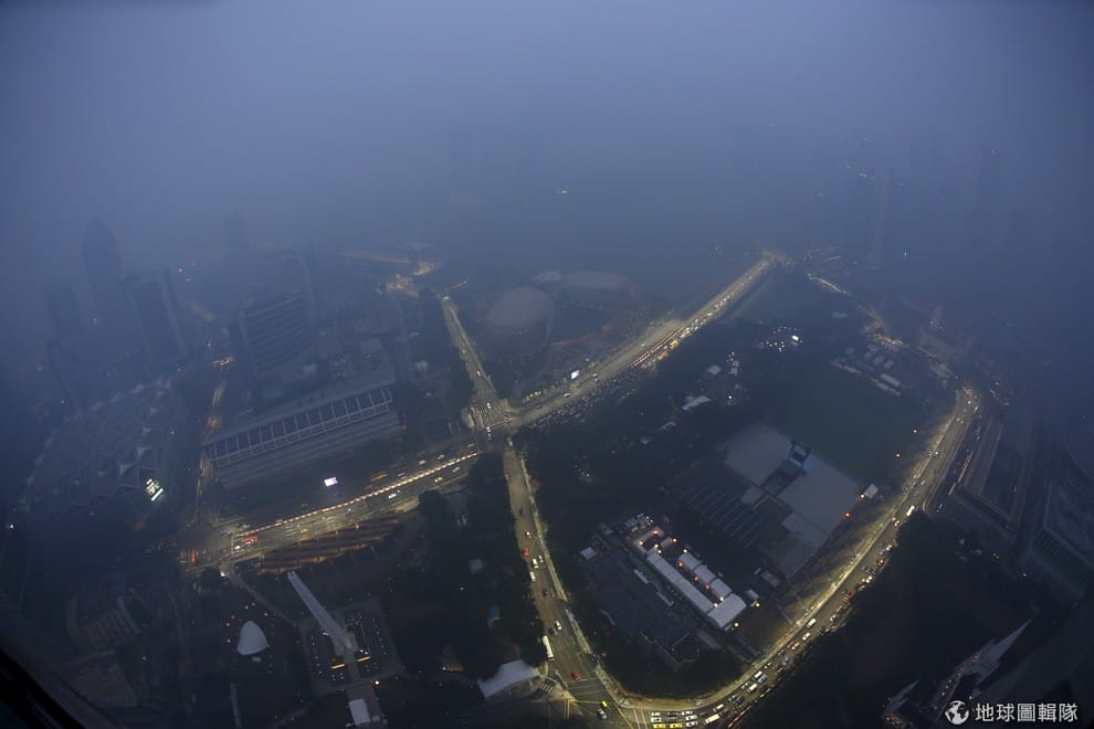 在一級方程式(F1)賽車的比賽場地上空,濃霧盤旋不去。近日,嚴重的霾害侵襲新加坡,造成空氣品質下降,這些濃霧是從印尼的蘇門答臘島和加里曼丹島飄過來的,當地農民因為使用火耕的關係,造成森林大火,大火造成的濃煙也飄到鄰近的新加坡還有馬來西亞,影響範圍擴大。