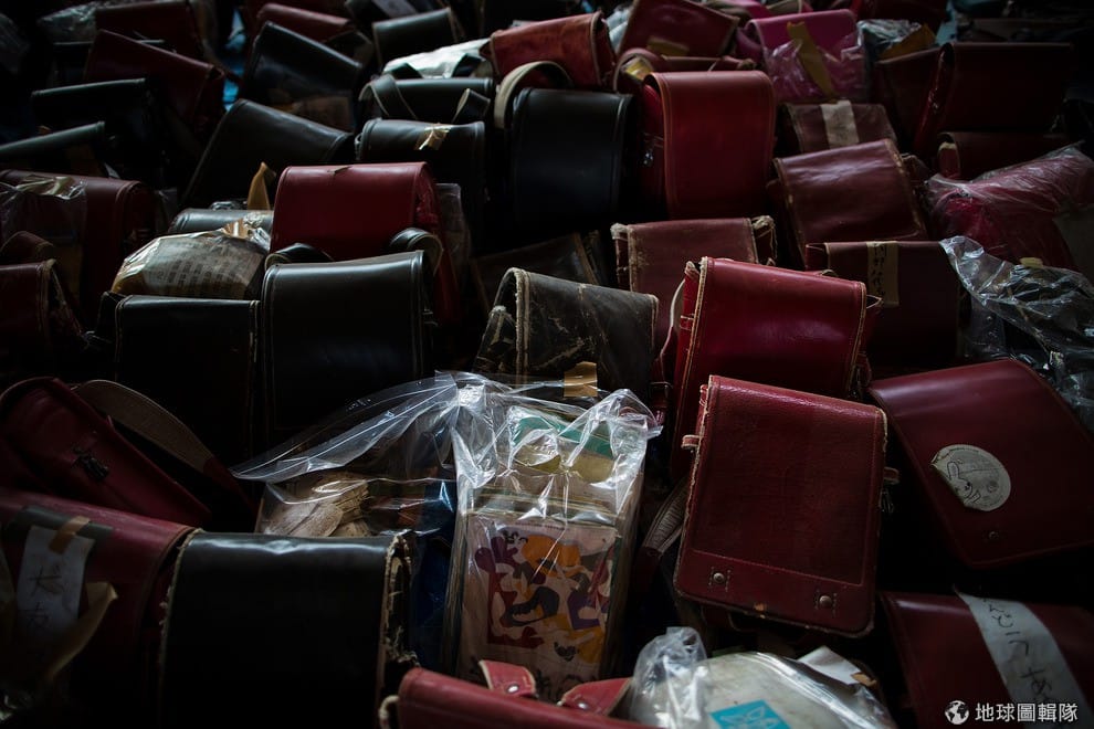 捐贈給名取市災民的小學書包,在體育館內堆成小山。Athit Perawongmetha/Getty Images)