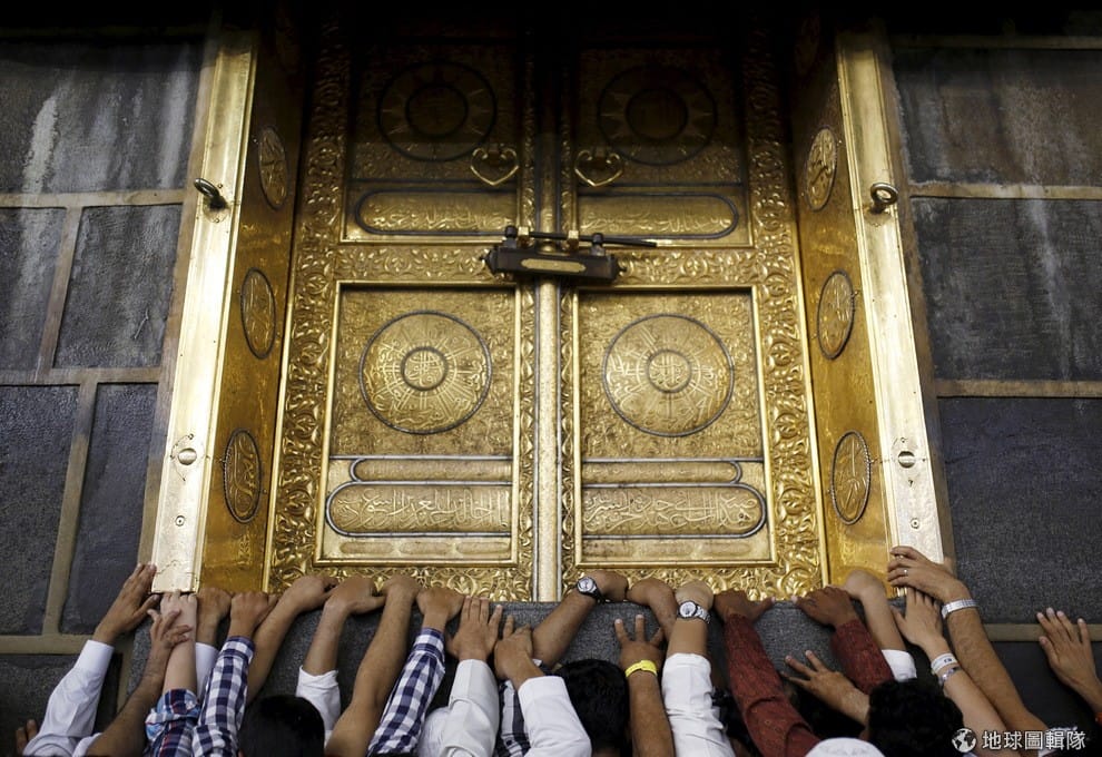 路透社信徒在離開麥加前會再來天房繞行告別,圖為一群信徒手碰天房祈福。