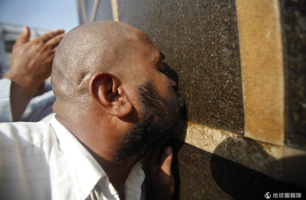 路透社信徒們每繞一圈都從親吻天房上的黑石開始起算,圖為一名信徒親吻黑石。