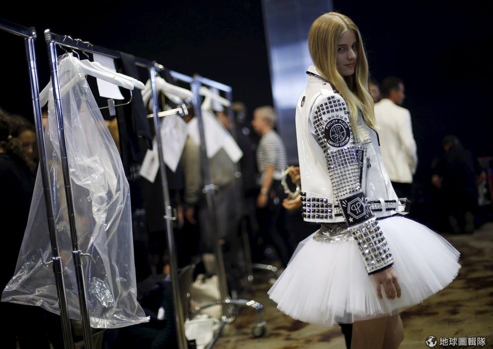 一名模特兒在後台穿著德國設計師菲利浦普萊因(Philipp Plein)的最新春夏服飾,朝著鏡頭嫣然一笑,時值米蘭時裝周,各大品牌都紛紛推出最新設計,搶攻時尚人士的眼球和消費者的荷包。