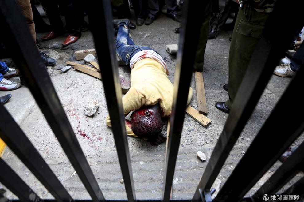 一名男子血流滿面地倒在首都奈洛比的大街上,他被懷疑偷人手機而遭到攻擊。攻擊事件發生不久前,大批民眾齊聚位於首都的自由公園,加入老師們的示威陣容,向政府表達要調薪的訴求。