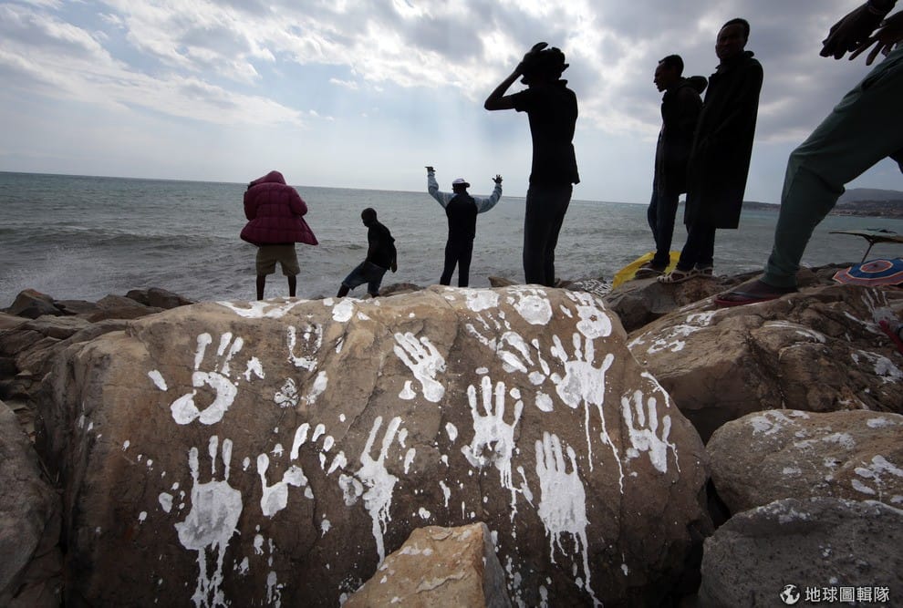 一群來自蘇丹還有厄利垂亞的難民來到法國和義大利的邊界,站在蓋滿白手印的岩石旁往地中海張望,等著前進心中的夢幻國家尋找新生活。