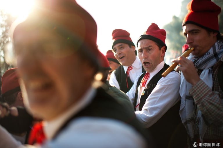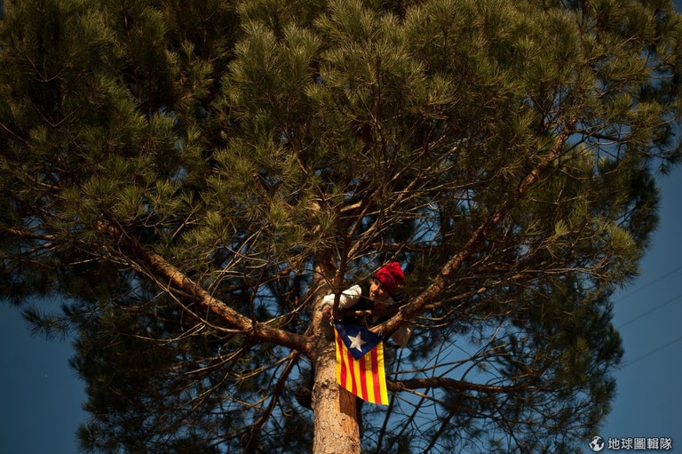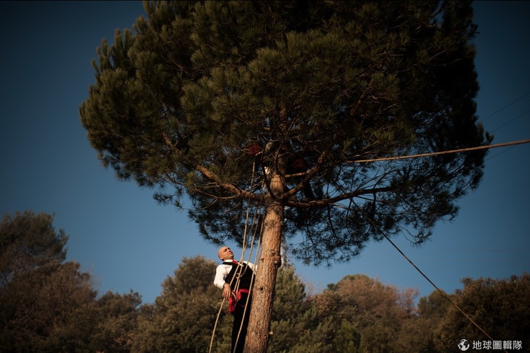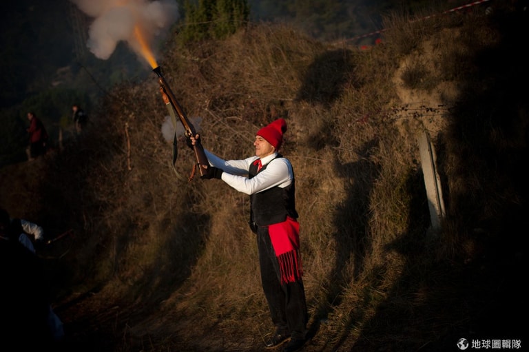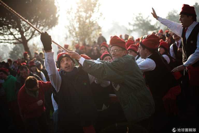 位在巴塞隆納的「聖特里斯」(Centelles)小鎮,居民在冬至時期會舉辦大型的「松樹祭」(La Festa del Pi);慶典期間,只要是出生在當地的居民,會通通換上傳統服飾,同時把代表他們的紅色穿戴滿身,整裝完畢的居民會再抓起步槍、大夥相約衝進森林中找尋最適合當「祭品」的松樹。David Ramos/Getty Images