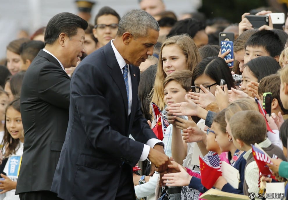 歐巴馬和習近平與夾道歡迎民眾握手。