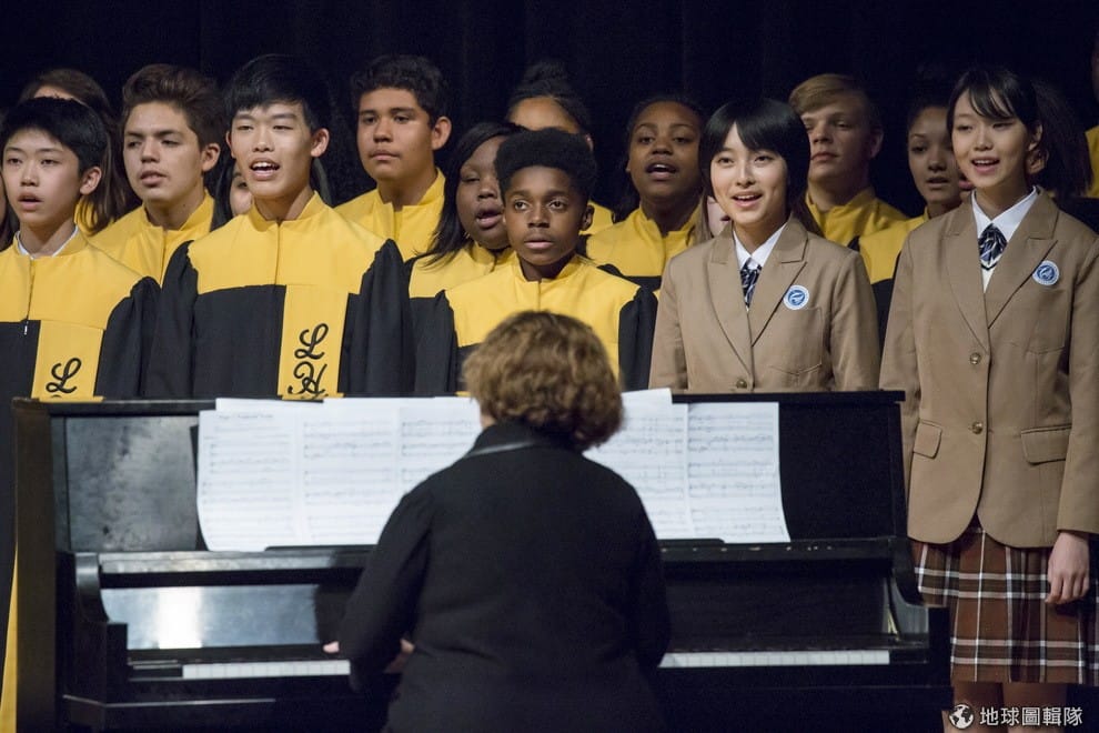 著黑袍黃飄帶的學生合唱團,伴著一台鋼琴伴奏開始了演出。如果只聽歌聲和咬字,你甚至會以為是中國學生合唱團。