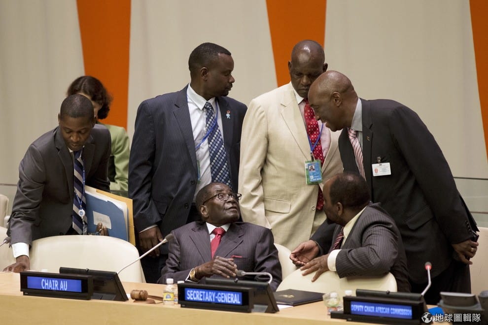 聯合國大會上,辛巴威總統穆加比(圖中抬頭者,Robert Mugabe)和其他與會者打招呼,他們即將召開第六屆的維護剛果區民主共和大會(Regional Oversight Mechanism of the Peace, Security and Cooperation Framework for the Democratic Republic of the Congo and the Region)。