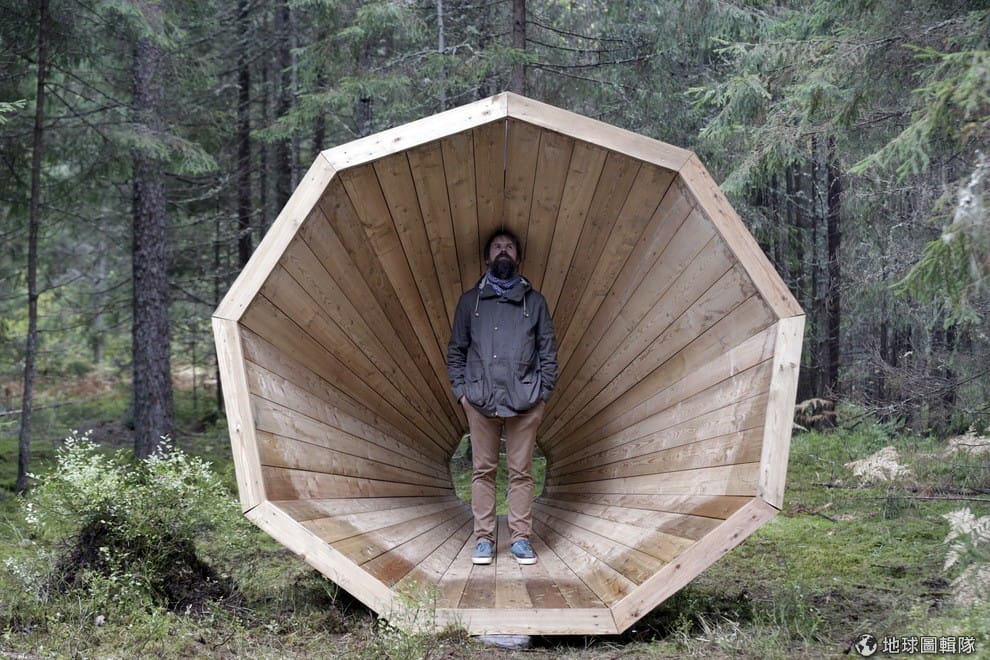 照片中的男子名叫普雷克斯(Hannes Praks),他是愛沙尼亞藝術學院(Estonian Academy of Arts)室內建築系學生,他站在一座巨大的木造擴音器中,這樣的裝置藝術總共有三座。原本,建築系的教授是希望學生們到森林中找靈感,做出以「森林圖書館」為題的作品,但學生們發現要讓書在室外挨過秋冬的風霜是不可能的,所以到最後,他們決定在森林中打造三座巨型木造擴音器。