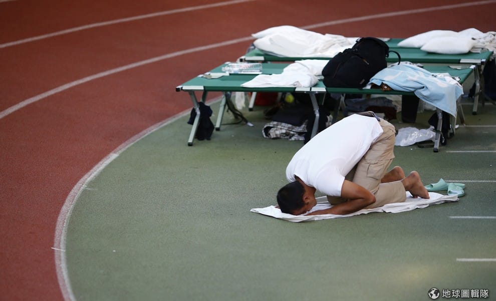 哈瑙的難民收容中心內,一名穆斯林正虔心祈禱。