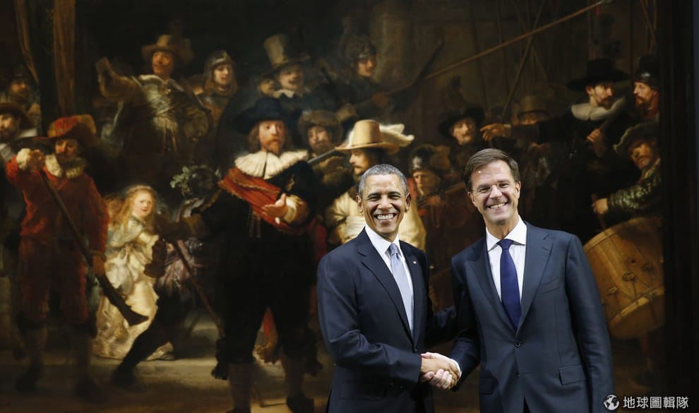 林布蘭的名作《夜巡》是阿姆斯特丹國家博物館的鎮館之寶,更是觀光客必看的作品。圖為荷蘭首相呂特(圖右)帶著美國總統歐巴馬來欣賞《夜巡》。