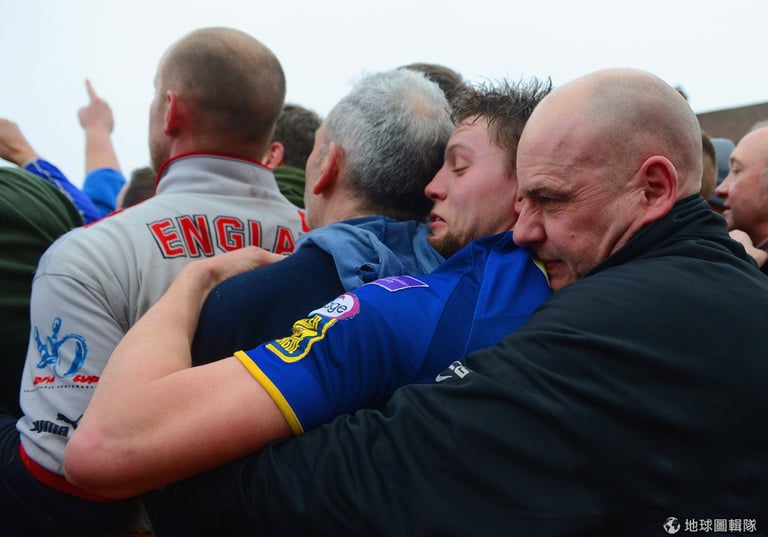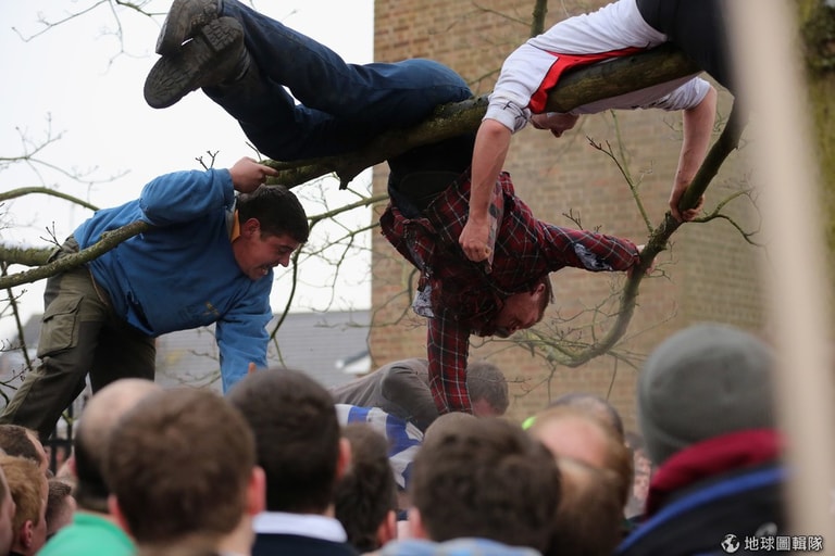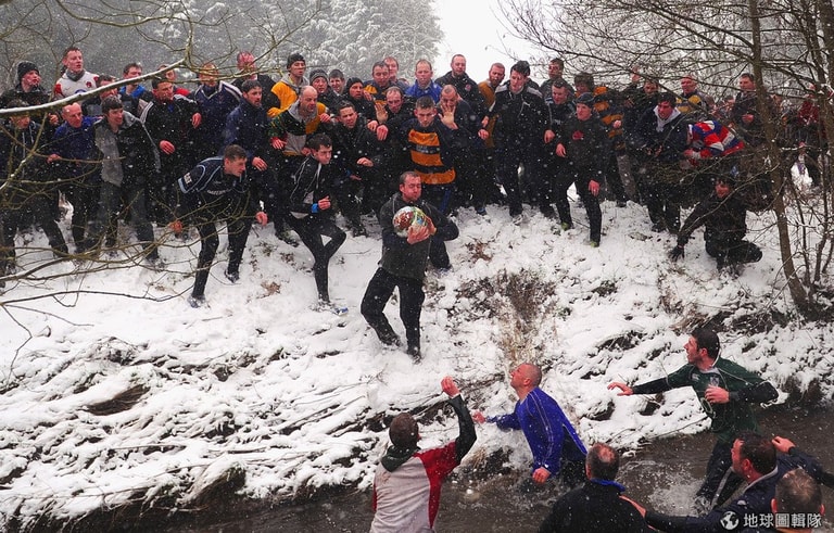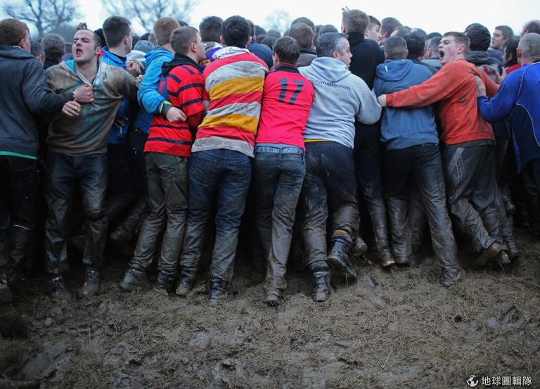 最特別的是,這比賽雖然叫做「足球」,但其實競賽隊伍都是用上半身來傳球,所以這項運動也有「抱抱球」(hugball)的別稱!將近上千位的參賽者用一連串的撲抱動作傳球,氣氛激烈又充滿危險,此外,比賽的得分方式與傳統把球踢進對方球門的規範不同,參賽球員要盡可能把球「帶回」自己屬地,並擊中自己地盤內的「石磨」3次(賽事規範見文末)。Michael Regan/Getty Images