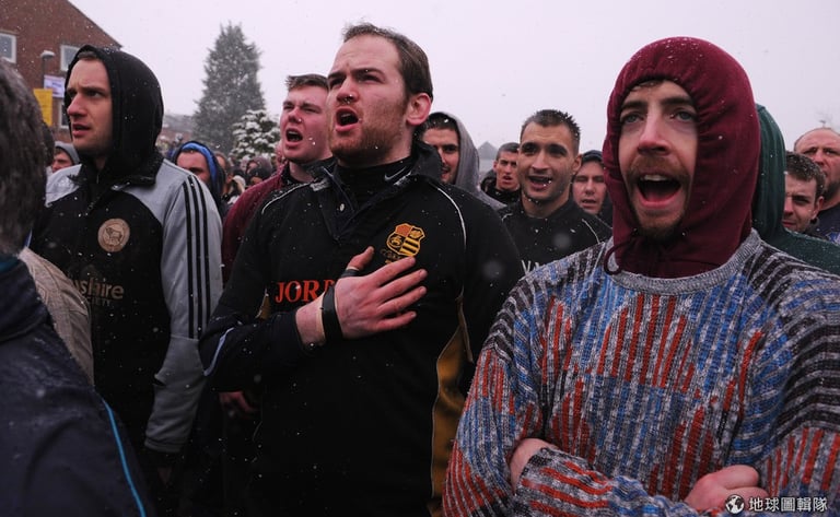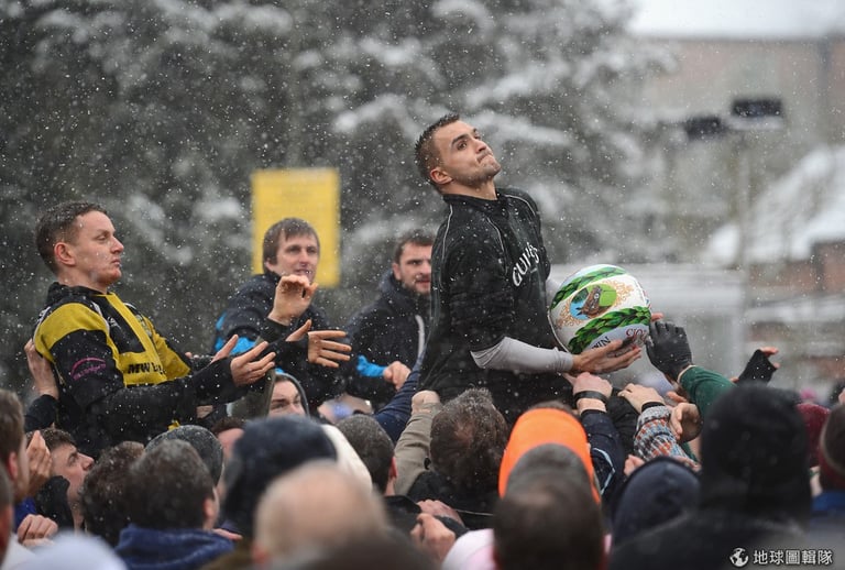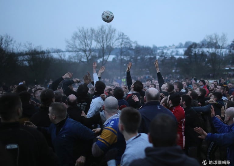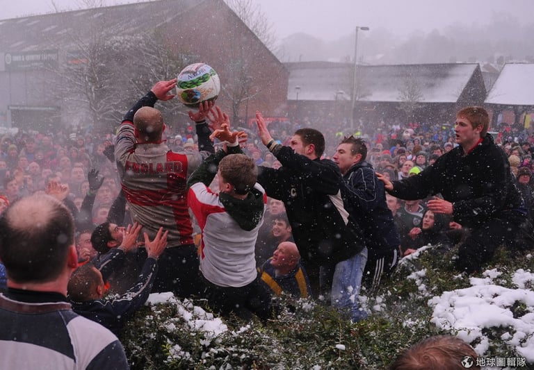每年齋戒月前一天和當天,英國的「阿什伯恩」市(Ashbourne)就會舉辦當地特有的「皇家聖灰節足球賽」(The Royal Shrovetide Football Match);這項球賽可說是歷史淵遠,競賽源頭最早可以追溯回12世紀,然而,舉辦比賽的確切的原因已經不可考,因為相關紀錄在1890年時因大火付之一炬。比賽的來由,目前最受歡迎的說法是,源自早期斷頭台行刑後,死刑犯的人頭會被拋向等在台下的群眾,但這項說法沒有確實的資料佐證。Michael Regan/Getty Images