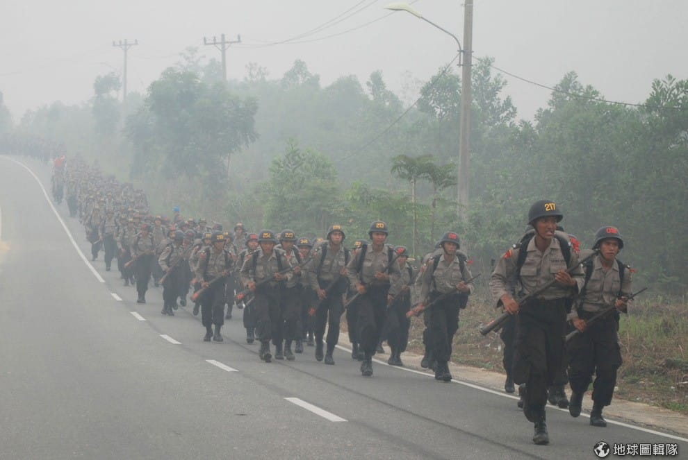 國家警校(SPN)學生正在霧霾中持續前進,當地政府為解決森林大火的肆虐派出將近 21,000名警消人員投入打火任務。
