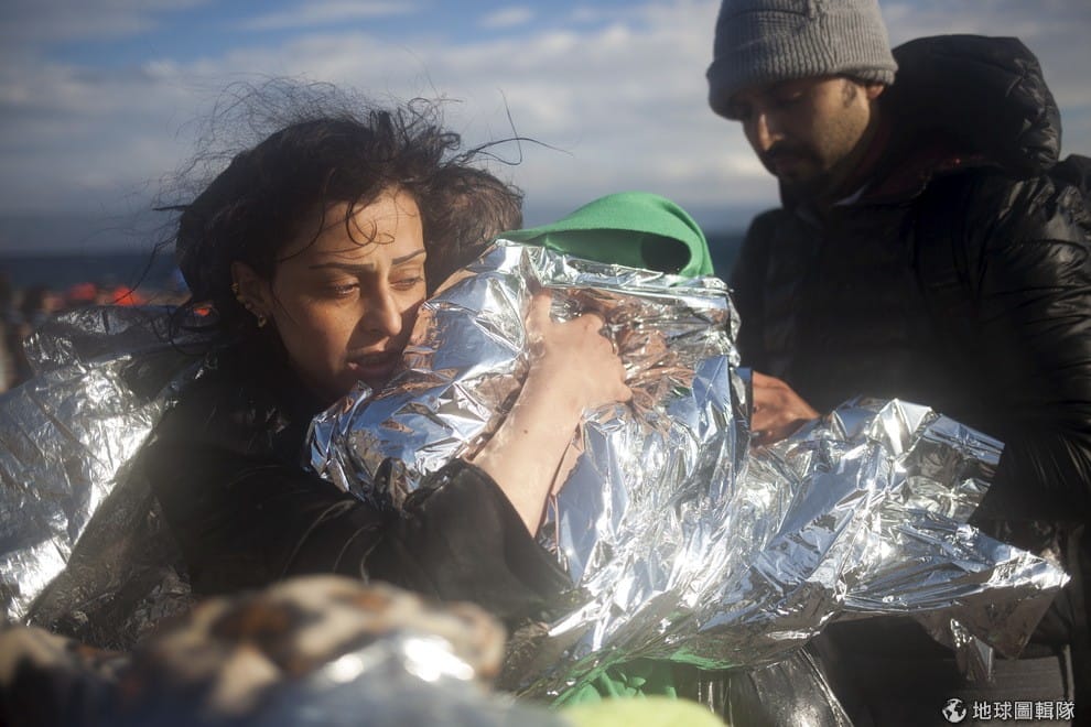 剛踏上列斯伏斯島(Lesbos)的女子,趕緊用旁人遞上來的保暖毯裹住懷中的寶寶。
