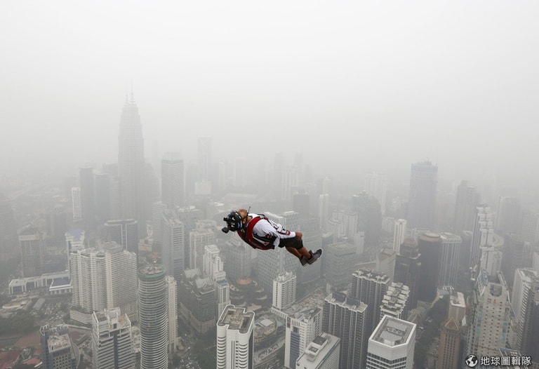 吉隆坡塔上,一名極限定點跳傘(BASE jump)好手從離地 300公尺高空處跳下,他四周的空氣因霾害影響呈現霧濛濛的狀態。