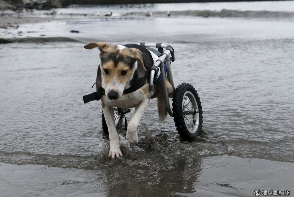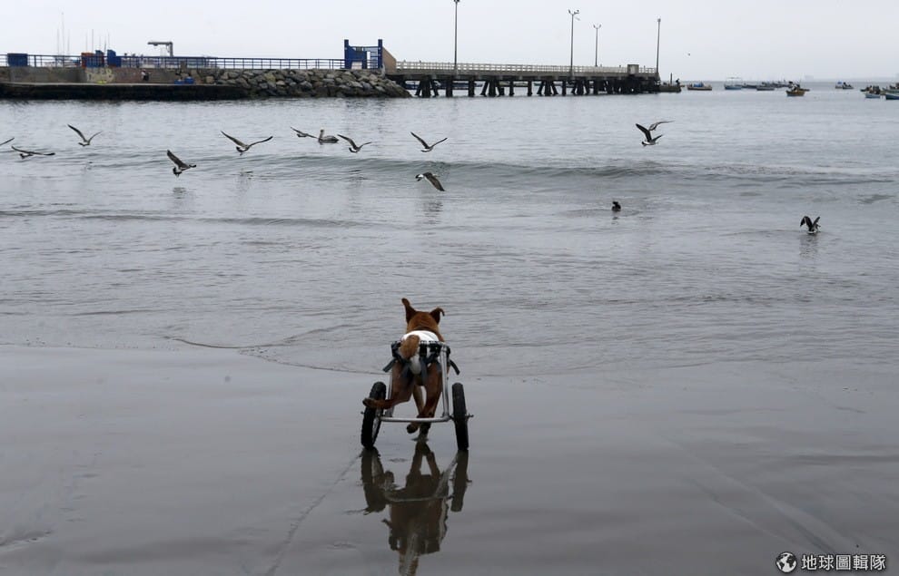 路透社狗狗佩魯沙(Pelusa)在輪椅的幫忙下,盡情地追逐海鷗。