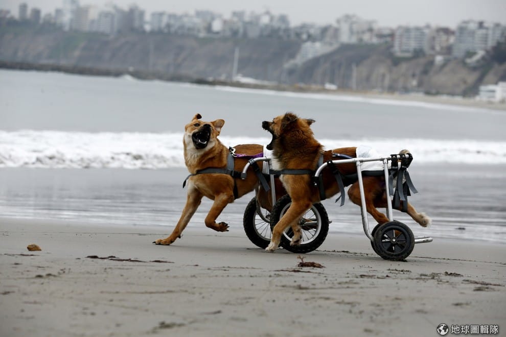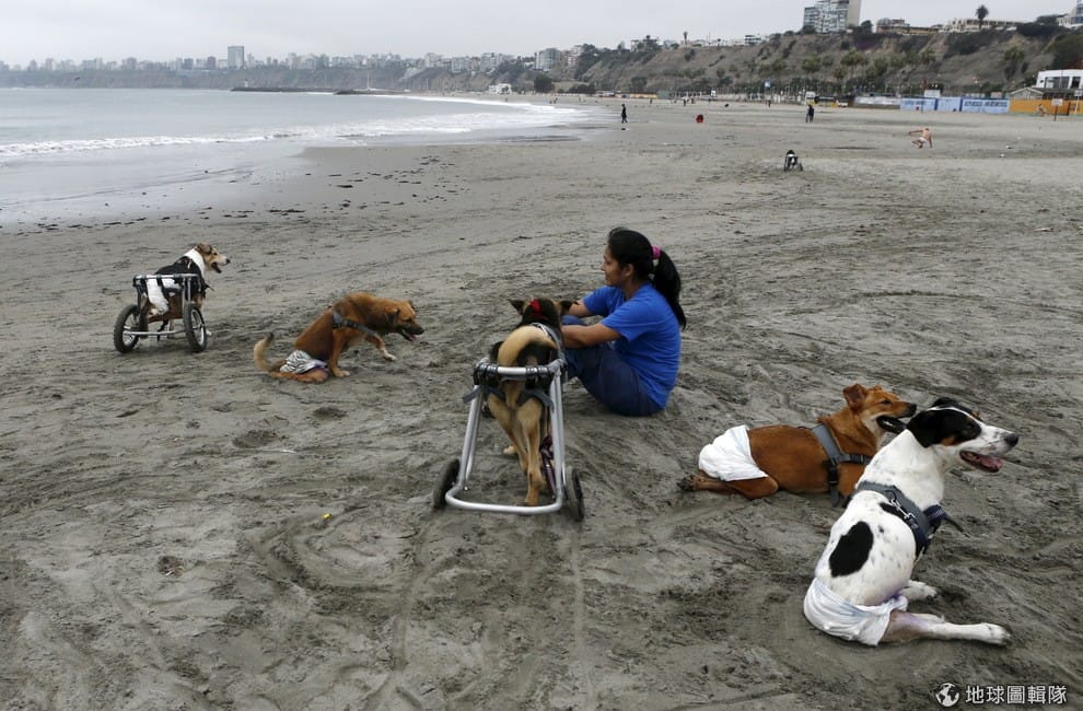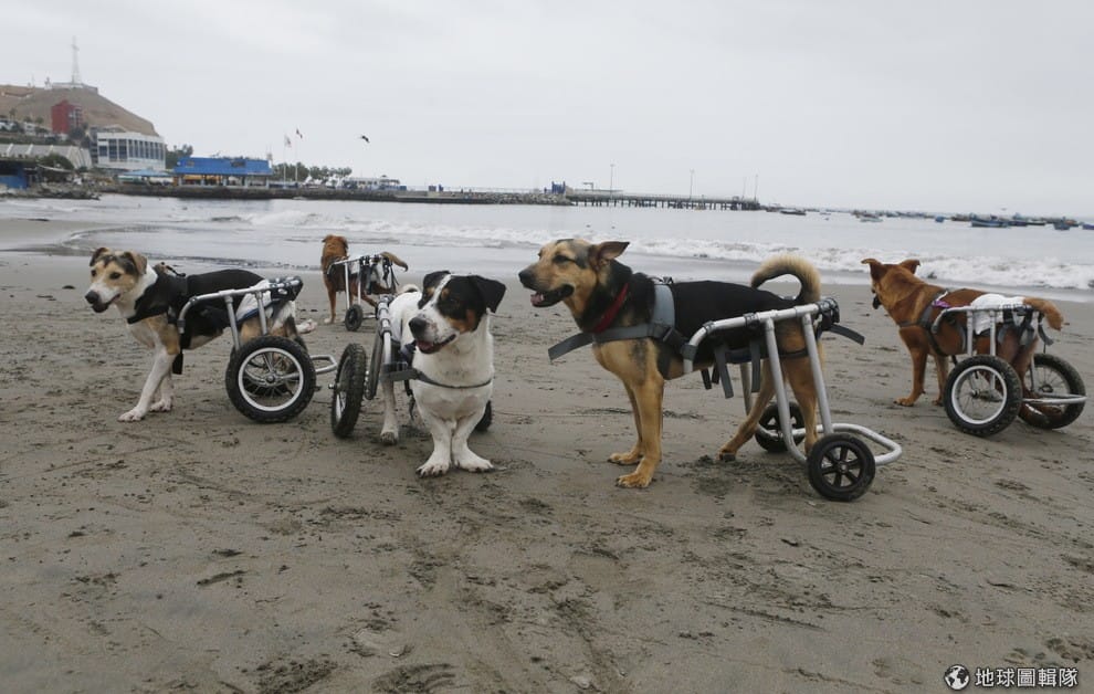 莫蘭邊帶著狗狗在海邊散步邊說:「我們現在收容了大約 50隻狗,在這群殘疾的狗狗之中有 6隻坐著輪椅,3隻截去了一隻腳。」