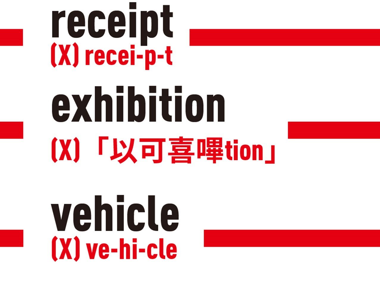 重音節在「ex」,發音如every(每個)中的e那樣發音,不是example(例子)的e。例子如exit、exercise、execute。此外,h不發音,ex直接和i連在一起,像acer的a和cer中間夾了「ㄎ」的音。