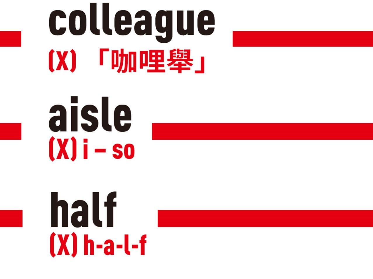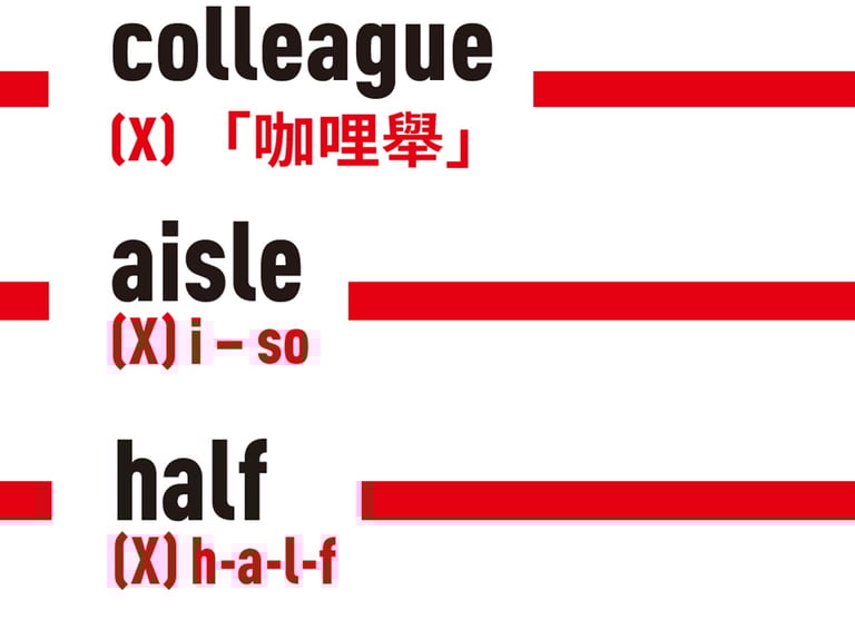 往往一看到這個字,便不多想地唸成h-a-l-f,這麼一來,就跟字意一樣,只對了「一半」。第三個字母l不需出聲,唸成h-a-f。