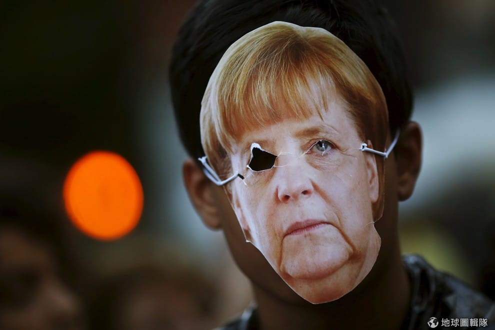 梅克爾對難民的歡迎態度引來正反不一的評論。圖為一名支持梅克爾決定的民眾,他戴著梅克爾肖像的面具。