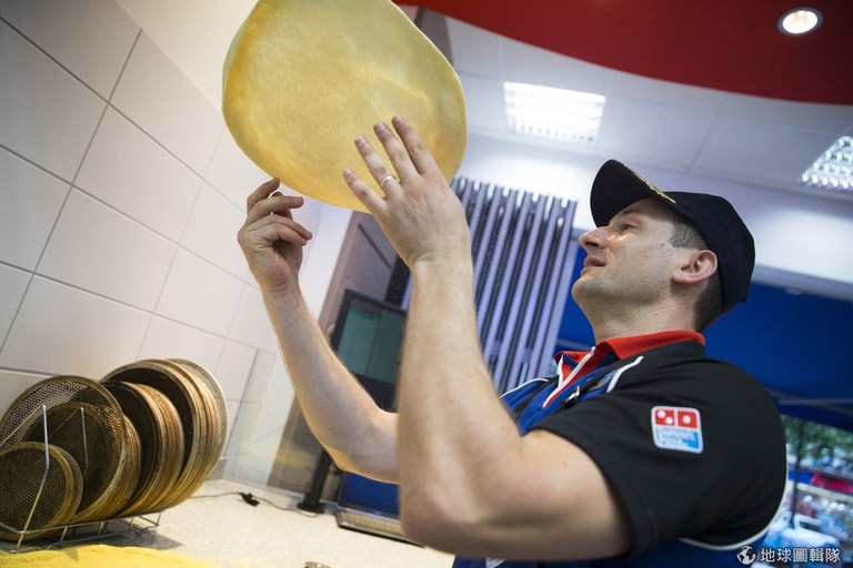 一名達美樂的員工正在製作披薩,只見他把披薩餅甩向空中。