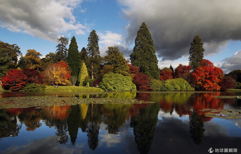 英國的謝菲爾德公園(Sheffield Park Garden)內,清澈的湖水與橘紅綠相間的樹林形成一幅美景。