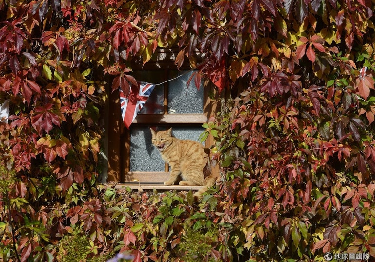 英國北英格蘭區一處民宅外,爬滿植物的窗檯有隻橘貓窩在其中。