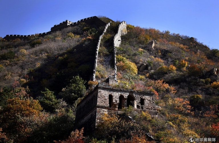 北京响水湖附近的長城被轉紅的山林美景包圍。