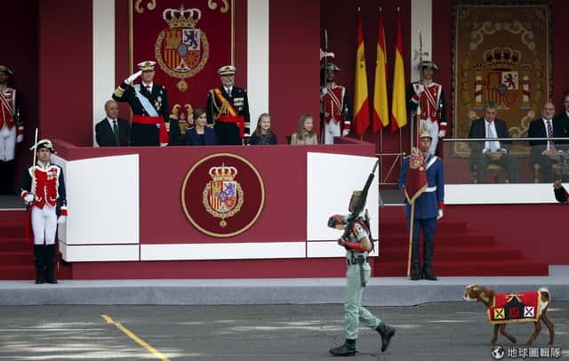 西班牙外籍兵團的吉祥物「山羊」在閱兵典禮上遊行。10月12日這天是西班牙國慶日,西班牙飛利浦(Felipe)國王帶著家人一起出席首都的閱兵典禮,照片中坐在台上的皇室成員由左至右分別是飛利浦國王、萊蒂齊亞(Letizia)王后、萊昂諾爾(Leonor)公主、蘇菲亞(Sofia)公主。
