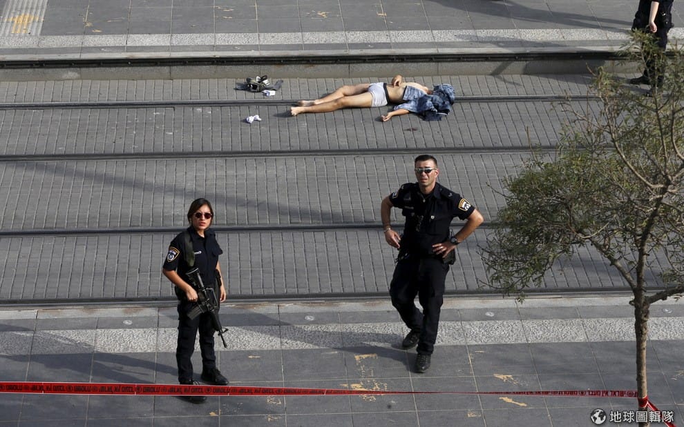 以色列警察站在屍體附近警戒著周圍,倒在地上的遺體是一名持刀攻擊別人的巴勒斯坦人。12號的時候,兩名分別是 13歲、15歲的巴勒斯坦人持刀刺傷他人,造成一名 13歲以色列男孩重傷。
