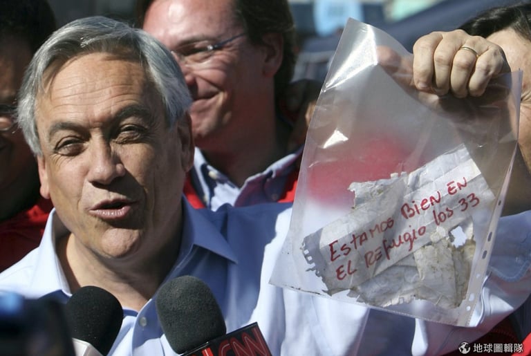 當時的智利總統皮涅拉,手上高舉著礦工從地下傳上來的紙條,上面寫道:「我們 33個人在避難所一切都好。」