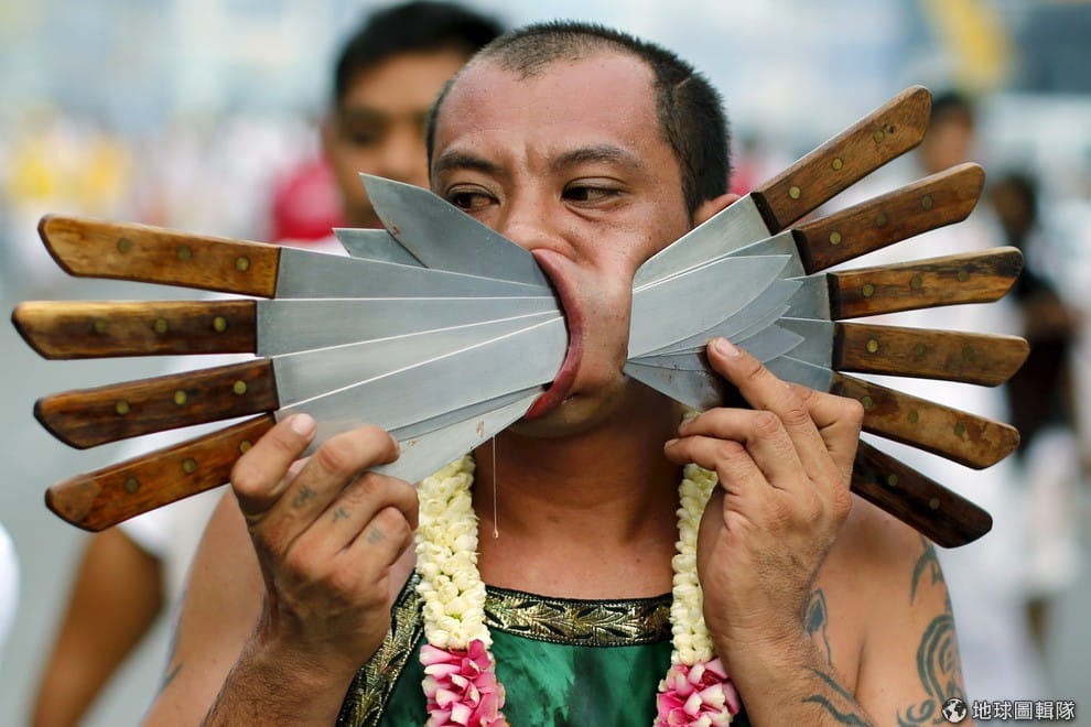 傳統節日九皇齋節上,1名男人將刀子穿過自己的臉頰。每年農曆9月,普吉島(Phuket)都會舉辦連續9天的九皇齋節,根據《維基百科》,泰國的九皇誕習俗源自福建華人,以天地會義士傳說爲主。後來越來越多的本地人參與到節日中,現已成爲泰國的一大節日。泰國最大的華人聚居地普吉島每年都會舉辦盛大的九皇齋節。