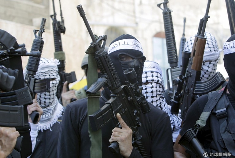 巴勒斯坦武裝組織法塔赫(Fatah)的成員拿著槍抗議以色列。巴勒斯坦人和以色列人之間的衝突不斷擴大,吞沒了耶路撒冷和約旦河西岸,目前已經有 35名巴勒斯坦人和 7名以色列人死亡。